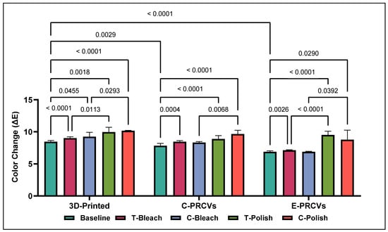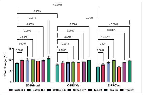 Meanwhile, on day 7, immersion in tea resulted in ΔE values of 10.689 ± 0.771, 9.926 ± 0.355, and 9.611 ± 0.220 for the 3D-printed veneers, C-PRCVs, and E-PRCVs (Figure 2).