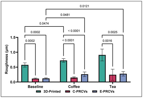 Artificial aging by immersion in coffee and tea caused significant changes in Ra values. After immersion in coffee, the 3D-printed veneers showed a significantly higher increase in Ra (0.724 µm ± 0.062) compared to the 3D-printed baseline. Meanwhile, the E-PRCVs showed significantly higher Ra (0.261µm ± 0.078) compared to the C-PRCVs (0.148 µm ± 0.030). However, no statistical difference between the C-PRCVs and E-PRCVS was detected. After immersion in tea, statistically significant differences were found for the pairs of 3D-printed veneers and C-PRCVs (p = 0.002) and 3D-printed veneers and E-PRCVs (p = 0.003).