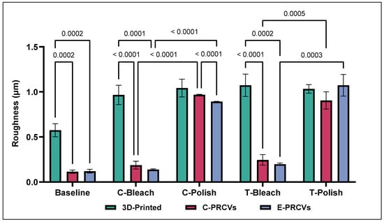 Comparison of the means of surface roughness (Ra) after bleaching and surface repolishing of stained 3D-printed veneers, C-PRCVs, and E-PRCVs.