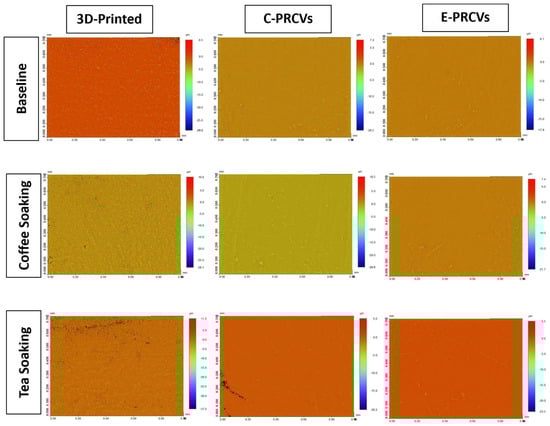 Beyond the choice of material, the surface quality can affect plaque accumulation and restoration discoloration [18]. Furthermore, composite-based materials tend to absorb more water, leading to the breakdown of their organic matrix and resulting in rougher surfaces [35]. Notably, coffee and tea cause color changes due to low polarity molecules that penetrate the resin matrix’s deeper layers [39]. In addition to causing matrix degradation and the absorption/adsorption of colorants, they also increase the surface roughness of restorative materials due to the presence of tannins [30,40]. In this study, at baseline, the PRCVs had significantly lower Ra values than the 3D-printed veneers. Notably, the baseline surface quality of the E-PRCVs displayed a notable reduction in surface roughness compared to the C-PRCVs. The manufacturer of the E-PRCVs claims to have developed a tempering process for the final surface finish. This might be the reason for the improved surface quality at baseline.