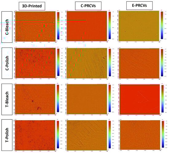 Figure 6 and Figure 7 show the representative 3D reconstructed images of surface topography obtained for different groups at baseline and after surface treatment using in-office bleaching and surface repolishing. It can be noted that surface treatment with in-office bleaching and surface repolishing presented the roughest surfaces for 3D-printed veneers, while in-office bleaching showed the smoothest surface for the C-PRCVS and E-PRCVs compared to the rough surface produced after surface repolishing.
