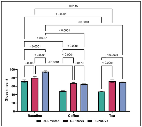 Aging by immersion in tea resulted in a significant reduction in the GUs of 3D-printed veneers to 47.187 ± 0.566 GUs (p < 0.0001) compared to baseline, while that of the C-PRCVs was significantly reduced to 72.034 ± 3.531 GUs (p < 0.001) and that of the E-PRCVs was significantly reduced to 69.444 ± 1.292 GUs (p < 0.0001) compared to its counterpart at baseline.