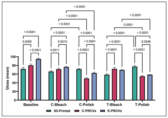 Comparison of the means of surface gloss (GUs) after bleaching and surface repolishing of stained 3D-printed veneers, C-PRCVs, and E-PRCVs.