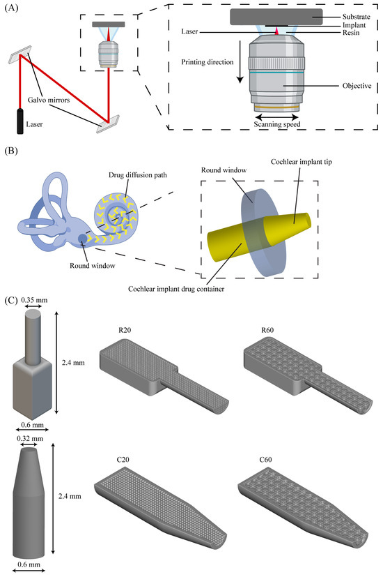 The implants were designed through a workflow that combined two software suites: SolidWorks 2021 (Dassault Systèmes SE, France) and nTopology 2.6 (nTopology Inc., New York, NY, USA). SolidWorks was used to design the outer geometry of the implants, while nTopology was applied for the design of their inner, porous geometry. The final design was assembled in nTopology, where both designs were merged and prepared for printing. The output file was exported as a standard tessellation language (STL) file, which is suitable for 3D printing. The implant design (outer and inner geometries, dimensions) considered the functional requirements and anatomy of the human inner ear (round window). To increase the bioavailability of the locally administered drug and to effectively deliver the drug directly to the cochlea, the design included a main body that serves as a drug reservoir and a tip that penetrates the cochlea through the round window (Figure 1B). Two different implant shapes were considered, namely rectangular implants (R) with a cylindrical tip and cylindrical implants (C) with a tapered tip. The outer designed dimensions of the cochlear implants were 2.4 × 0.6 × 0.6 mm3 (L × W × H). An internal porous structure was designed to control the drug release, which consisted of an interconnected network of square pores. Two different pore sizes were included for each shape, namely, 20 and 60 μm, resulting in four different implant designs (i.e., R20, R60, C20, and C60) (Figure 1C). The pore size was chosen based on the results of a preliminary study (as detailed below) and in line with the existing literature on DDSs [40].