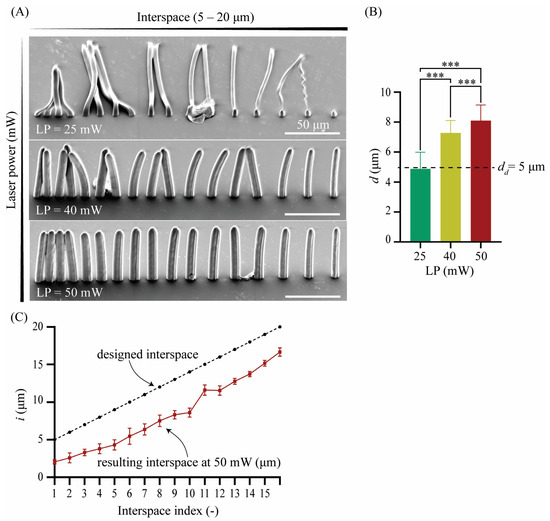 (A) The SEM images of the 2PP-printed pillar arrays with a dd of 5 μm and LP values of 25, 40, and 50 mW (tilt angle = 45°); (B) the quantification of the apparent pillar diameter (d) and comparison with the designed pillar diameter (dd) (*** p < 0.0001); and (C) quantification of the apparent interspace (i) for an LP of 50 mW and comparison with the design values.