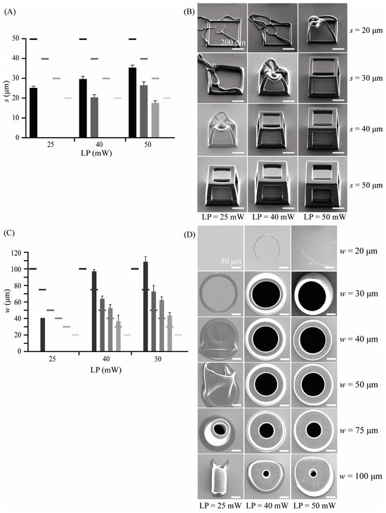 (A) The effects of laser power (LP) on the width (s) of the struts of the cubic unit cells presented as mean ± standard deviation (n = 3) and compared to the design values (grayscale short lines) (scale bar is 200 μm); (B) the SEM images (40° tilt angle) used for the assessment of the structural integrity of separate cubic unit cells designed with a strut width of s = 20–50 μm for LP = 25, 40, and 50 mW; (C) the effects of the laser power (LP) on the wall thickness (w) of the hollow cylindrical structures presented as mean ± standard deviation (n = 3) and compared to the design values (grayscale short lines) (scale bar is 50 μm); and (D) the SEM images (top view) used for the assessment of the structural integrity of the hollow cylindrical structures designed with a wall thickness of w = 20–100 μm for LP = 25, 40, and 50 mW.