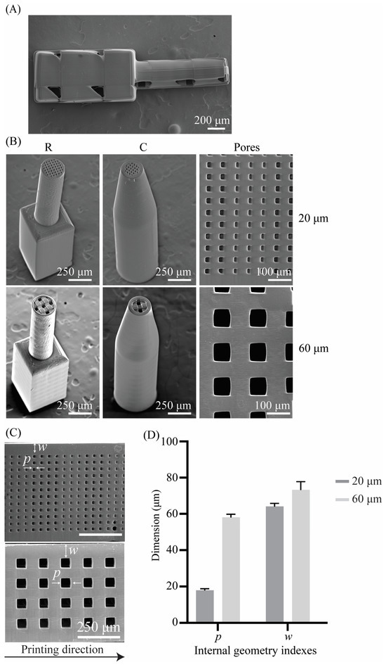 (A) A SEM image of a horizontally 2PP-printed R-type cochlear implant (top view); (B) SEM images of 2PP-printed porous cochlear implants (tilt angle = 30°) and their internal porous structure and pore size; (C) SEM images of the interconnected pore network with pore sizes of 20 μm and 60 μm, where p is the pore size and w is the wall thickness of the implant; and (D) quantification of the pore size (p) and wall thickness (w). The values are presented as mean ± standard deviation.