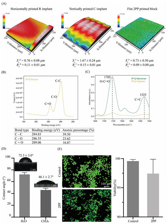 (A) The surface roughness measurements (Sa, Ra) for horizontally and vertically printed implants as well as flat 2PP-printed blocks; (B) XPS spectra of C 1s peaks in IP-Q after polymerization, and the binding energy and atomic percentage of C 1s series in the 2P-printed IP-Q specimens, (C) FTIR spectra in the ATR mode of the IP-Q photoresist (yellow) and polymer after 2PP (green); (D) contact angle measurements on flat 2PP-printed IP-Q blocks for water and diiodomethane with the corresponding pictures of the shape of the droplets (scale bar is 1 mm), and the contact angle is presented as mean ± standard deviation; and (E) the live/dead staining of J774A.1 macrophages after 48 h of culture on control (i.e., well plate) and on 2PP-printed IP-Q flat block specimens (live: green, red: dead) and the quantification of the macrophage viability (%) for the control and the 2PP-printed specimens (scale bar is 100 μm).