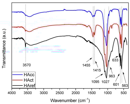FTIR spectrum corresponding to the HAcc, HAct, and HAref samples.