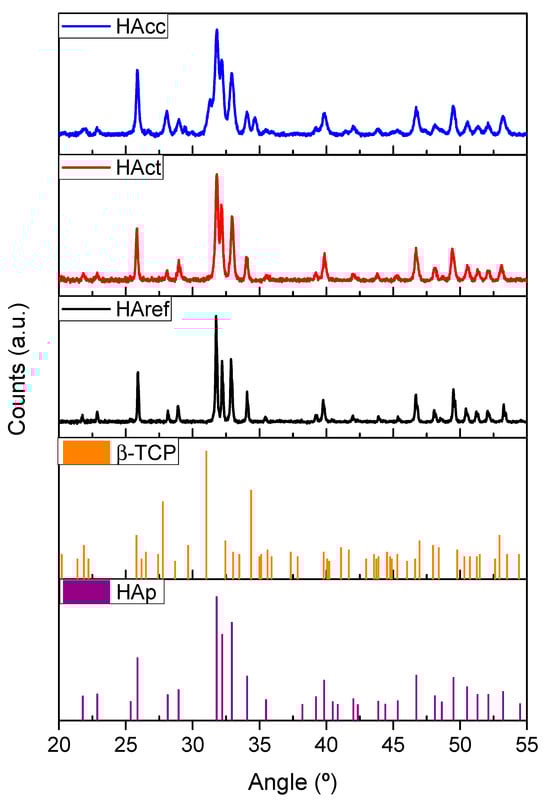 The crystalline structures of the investigated materials were unraveled using the XRD technique. Figure 2 shows the XRD diffractograms corresponding to the HAcc, HAct, and HAref samples. The diffractograms revealed the presence of the hexagonal hydroxyapatite structure (HA). This is a unique phase observed for HAct and HAref. However, in the case of the HAcc sample, which was the one prepared using Carbocal®, peaks corresponding to β-tricalcium phosphate (TCP) were clearly observed. No additional phases (such as free calcium oxide) were identified.