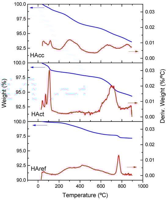 Figure 3 shows the thermogravimetric curves obtained for the three samples heated from room temperature up to 900 °C. The weight losses were about 5–6% for the synthetized samples (HAcc and HAct), while for the reference it was about half (2.5%). For better identification of the different weight loss processes, the derivative curves were also included. The small peaks appearing in the 35–200 °C range corresponded to adsorbed water, which was almost negligible in the case of the reference sample. The release of water from the lattice was associated with the weight loss process occurring in the 200–400 °C range. As can be seen, this process was much faster in the case of the hydroxyapatite prepared from Carbocal®. Two additional peaks at higher temperatures (600–900 °C) were probably related to the dihydroxylation and decarboxylation processes [].