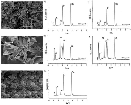 Figure 4 shows SEM micrographs of the materials analyzed in the present work. Figure 4a corresponds to the HAcc sample and shows that two main morphologies were present in the HAcc powder, including flat sheets (region marked as B) and more spherical morphologies of smaller sizes (region marked as A). In comparison, the reference sample, HAref, also showed the two morphologies mentioned (see Figure 4d), although it seemed that the flat sheets were of larger size. Regarding the HAct sample, SEM imaging showed a wider distribution of morphologies and sizes, as exhibited in Figure 4g. In the literature, flake-like morphologies have been observed upon calcination of waste poultry eggshells, and it has been demonstrated that it is not HA but another type of calcium phosphate-based biomaterial []. In that study, micrographs of powder obtained at a higher temperature and identified as a mixture of HA and monetite using XRD showed a more rounded morphology, similar to that observed in Figure 4a,d. EDX analyses were carried out to investigate the composition of the studied materials. These demonstrated that all the samples consisted of Ca, P, and O, as expected (it should be mentioned that the SEM holder was composed of an alloy of Al and Mg, and because of that, these elements also appeared in the spectra in different amounts based on the proximity of the holder to the region of analysis). The EDX analyses that were carried out also showed that the composition of the materials varied for the different morphologies found. Figure 4b,e correspond to the flat sheets in the HAcc and HAref samples, respectively, and here it was observed that the P/Ca ratio was larger than that found in Figure 4c,f, corresponding to the spherical morphologies in the mentioned samples. In the HAct sample, because the different morphologies were mixed in the powder, separate spectra for the different morphologies were not possible to acquire (see Figure 4h). The family of phosphate compounds is quite large, having different Ca/P ratios according to the material composition. In particular, the Ca/P ratio for HA was 1.67. Different Ca/P ratios in the range of approx. 1.5–2 were found in our EDX-SEM analyses of the different materials, with a ratio of 1.6 being found for the round morphologies in a few cases, which corroborates the result of 1.56 obtained using XRF compositional analysis and the presence of Mg at 1.3% []. Care should be taken in the quantification of the composition of mixed compounds using SEM, as signals from adjacent materials can be obtained together with that related to the compound of interest, leading to an averaging of the element content. Our results point to the existence of HA mixed with other phosphates, which is somewhat expected. In the literature, compounds with different compositions are obtained when extracting HA from waste materials. For example, HA synthesized from non-separated biowastes (animal bones) using heat treatments showed Ca/P ratios in the range of 1.58–1.94% for sintered samples, with the ratio for the raw materials being 2.79 []. In a different study, the ratios of Ca/P were found to be 1.56 and 1.88 for treated pig bone and as-synthesized HA, respectively, at 1000 °C []. In a study focused on the synthesis of HA from marine shell waste, Ca/P ratios of between 2.1 and 1.75 were obtained, and the difference from the theoretical ratio of 1.67 was attributed to traces of carbonate still present in the samples []. In other cases, however, HA has been obtained with a lesser amount of other compounds, such as when is it obtained from waste bovine bone using an alkaline digestion method, which provided a Ca/P molar ratio of 1.75, which is similar to previous reports using fresh bovine bones []. Regarding a potential compatibility of the material obtained with human tissue, it should be highlighted that no heavy metals were found in the EDX analyses performed, which is promising for biological applications.
