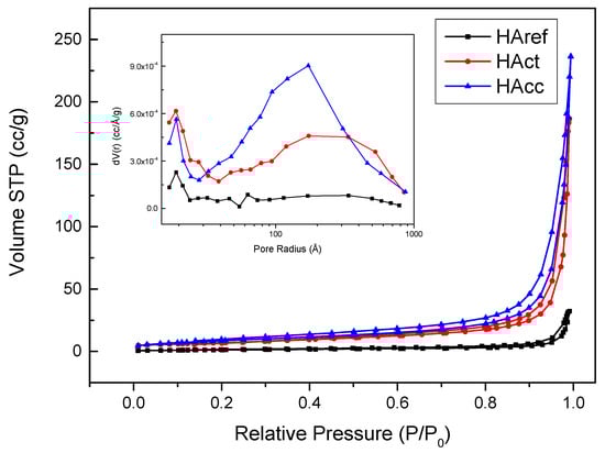 The distributions of the pore radii were plotted according to the BJH nitrogen desorption (inset in Figure 5). Peaks centered over 20 Å and 200 Å were observed, the latter being of higher intensity, mainly in the case of the HAcc material. As shown in the figure, the porosity of the reference sample was rather low, which was in good agreement with its very low surface area.