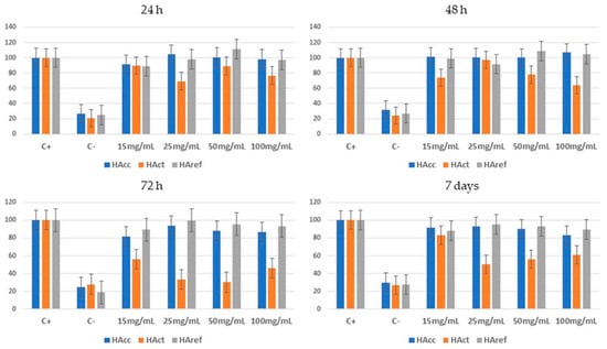 It is worth mentioning that the presence of HAcc, at certain concentrations, promoted cell growth, with values that exceeded the positive control without these differences being significant.