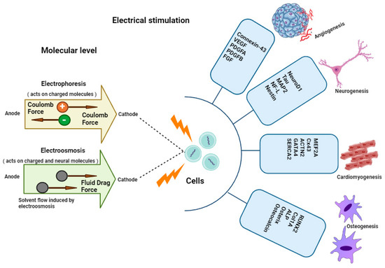 ES has emerged as a unique method in the field of tissue engineering and is widely used in regenerative medicine (Figure 1). In tissue engineering, ES serves as a transformative tool, harnessing controlled electrical currents to direct and accelerate the growth and development of biological tissues. By modulating cellular behaviors, it fosters cell proliferation, orchestrates tissue organization, and steers cell differentiation, all of which are critical aspects of tissue regeneration. This technique finds particular significance in areas like neural tissue regeneration, bone repair, and wound healing, where it aids in the restoration of functional tissues and hastening the recovery process. The application of electrical stimulation, optimizing its parameters to maximize its impact and highlighting its indispensable role in advancing the field of tissue engineering, has been reported in recent studies. At the molecular level, it enhances the movement of both charged and uncharged biomolecules across biological membranes through mechanisms known as electroosmosis and electrophoresis. These two processes are collectively referred to as iontophoresis [22]. Electrical cues trigger a cascade of intracellular events. These signals can prompt the release of growth factors, such as vascular endothelial growth factor (VEGF) or nerve growth factor (NGF), which in turn stimulate cell proliferation and migration. Additionally, electrical stimulation can activate ion channels on cell membranes, leading to changes in intracellular calcium levels, which are crucial for various cellular processes. This intricate interplay of electrical signals within cells orchestrates a symphony of molecular events, ultimately fostering tissue growth, repair, and regeneration in the field of tissue engineering.