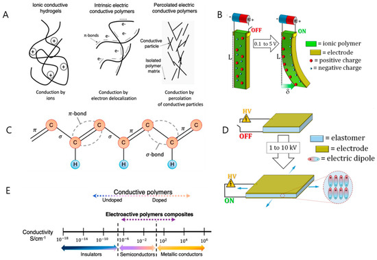 Types of EAPs. (A) different conduction mechanisms of EAPs [31]; (B) schematic representation of ionic electroactive polymer [32]; (C) electrically conductive polymers transfer electrons via intrinsic mechanism [31]; (D) schematic representation of two distinct families of electroactive polymeric actuators—electronic and ionic. Electroactive ionic polymer–metal composites, dielectric elastomers [32] (E) the conductivity spectrum of intrinsically conductive polymers and electroactive conductive material composites [31].