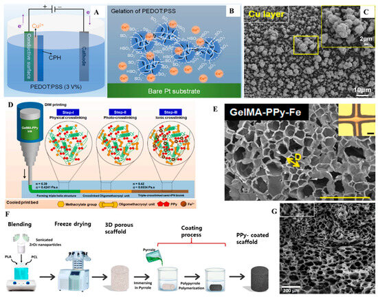 Fabrication of hydrogels based on EAPMC. (A,B) A conventional electrochemical cell for electrochemical gelation of aqueous PEDOT:PSS electrolyte. Under constant potential, Cu is entirely oxidized to Cu2+ ions [110]. (C) SEM image of Cu layer of PEDOT:PSS hydrogel (with modified Pt) [111]. (D) Schematic representation of fabrication of 3D-printed hydrogel with triple cross-linking mechanism. (E) SEM image of GelMA-PPy-Fe hydrogel, Yellow arrow indicates the pore diameter of corresponding images. (F,G) Schematic representation of fabrication of ZrO2 nanoparticle-incorporated 3D PCL/PLA scaffolds. The right side shows the SEM image of the PCL/PLA scaffold [111]. Based on [94].