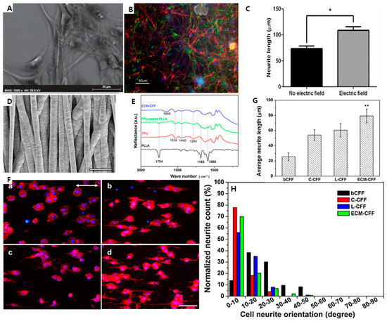 A previous study explored the cross-linking of PEDOT:PSS using an Au/Pd-layer hydrogel. Subsequently, ReNcellVM neural stem cells (NSCs) were introduced onto the laminin-coated surfaces and cultured. The culture medium contained EGF (20 ng/mL), FGF-2 (20 ng/mL), and B27 (20 g/mL) and cells were cultured for 4 days. Following this, the cells were subjected to a differentiation process for an additional 8 days, during which the aforementioned components were omitted. Simultaneously, the cells were electrically stimulated at 1 V with 10 ms pulses at a frequency of 100 Hz [115]. Scanning electron micrograph (SEM) images of electrically stimulated NSCs on cross-linked PEDOT are shown in Figure 4A. When using PSS substrates, electrical stimulation caused a change in the reorganization of the actin cytoskeleton, which appeared to be the source of the morphological changes in the cells described here, particularly stretching of the cells. Immunofluorescence analysis confirmed an increase in the neuronal population on the crosslinked PEDOT:PSS substrates upon exposure to ES, as shown in Figure 4B,C. Zhou et al. successfully synthesized a conductive fiber film (CFF) by electrospinning PLLA fibers and the subsequent electrochemical deposition of PPy NPs. The resulting CFF exhibited a core–sheath structure and demonstrated a conductivity of 10 S cm−1. This advancement holds promise for treating peripheral nerves [116]. Electrochemical deposition was used to create a PPy-coated PLLA fiber film. Figure 4D,E show the SEM images of the electrospun PPy-coated PLLA fibers. Attenuated total-reflection Fourier-transform infrared spectra of PPy, PLLA, PPy-coated PLLA, and ECM (extracellular matrix) CFFs (Figure 4F) show that nearly all of the cells were oriented along the fiber axis. More cells were observed with protruding neurites on C-CFF or LCFF than on bCFF, indicating that collagen- and laminin-coated fibers may stimulate PC12 cell differentiation and neurite growth. The average length of neurites was greater on ECM-CFFs (approximately 79 m) than on other CFFs (approximately 54 m on C-CFFs and 60 m on L-CFFs), demonstrating that ECM-CFFs greatly stimulated neurite growth. (Figure 4G). The orientation of neurites is shown in Figure 4H. The data revealed that a much higher proportion of neurites, 70% on ECM-CFFs and 77% on C-CFFs, expanded along the fiber axis compared to 14% on bCFF and 56% on L-CFFs. This finding strongly indicates that neurites on the ECM-CFF exhibit a notable tendency to extend along the fiber axis. The findings of this study demonstrated that the combination of ECM-CFF with NGF yielded substantial enhancements in both neurite development and direction [115].