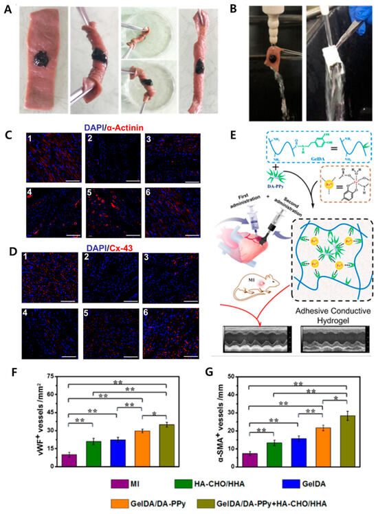 The myocardium has excellent conduction properties. PVDF is suitable for cardiovascular tissue engineering because of its unique properties of piezoelectric scaffolds. Lee et al. investigated the vitality and function of CMs and mouse embryonic stem cell-derived endothelial cells (mES-ECs) cultured on piezoelectric PVDF scaffolds [120]. Both mES-CMs and mES-ECs demonstrated good survival and adhesion to PVDF. Wu et al. investigated the development of Fe3+-induced ionic dexterity in the interaction between dopamine–gelatin conjugates and dopamine-functionalized PPy, specifically in the context of a self-adhesive conductive hydrogel patch (Figure 5A,B,E) [121]. The study employed immunofluorescence analysis to ascertain the cardiac structure within the infarcted area. To assess myocardial damage, the proteins actinin and Cx-43 were examined. Actinin is a crucial protein involved in the structure of the myocardium, while Cx-43 facilitates the transfer of electrical signals between myocardial cells [122]. When the myocardium is injured, the levels of both proteins are downregulated. In the myocardial infarction group, protein expression levels of actinin and Cx-43 were low. However, the expression of the two proteins increased in all hydrogel-treated groups, with the maximum expression levels of the two proteins occurring in the combination-treatment group (Figure 5C,D). Figure 5F,G show the quantitative microvascular density and arterioles in distinct groups based on the expression of vWF and SMA proteins.
