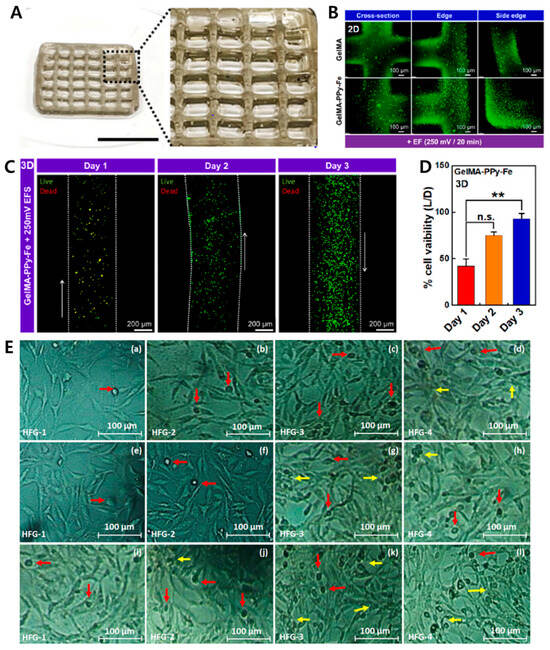Furthermore, incorporating EAPs into a biocompatible matrix allows for the creation of conductive biomaterials that can restore, maintain, or improve tissue function. Dutta et al. developed a stable and conductive bioink for direct ink writing-based 3D printing applications based on PPy-grafted gelatin methacryloyl (GelMA-PPy) with triple cross-linking (thermo-photo-ionically) [110]. During 3D printing, a triple-cross-linked hydrogel with a dynamic semi-inner penetrating polymer network demonstrated outstanding shear-thinning capabilities, increased form fidelity, and structural stability. The hydrogel ink in its original state exhibited flow behavior characterized as “plug-like non-Newtonian” flow when subjected to little disruption. The bioprinted GelMA-PPy-Fe hydrogel exhibited improved cytocompatibility (93%) with human bone marrow mesenchymal stem cells (hBMSCs) when subjected to microcurrent stimulation at 250 mV for 20 min daily (Figure 3D,E).