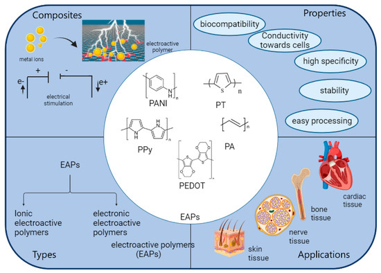 Furthermore, CPs can exert precise control over the application of electrical stimulation. However, the operation of these devices requires an externally supplied electrical field. Moreover, CPs allow the manipulation of chemical, electrical, and physical properties to fulfill the specific needs of the biological elements in which they are employed. This review focuses on piezoelectric polymers, such as polyhydroxybutyrate, polyvinylidene fluoride (PVDF), and poly (L-lactic acid) (PLLA), as well as CPs, such as PPy, polyaniline (PANI), PEDOT, and polyelectrolyte gels. The objective of this review was to analyze their distinctive properties and applications in tissue regeneration. Each division can be further subdivided into numerous branches. Several EAPs have been developed that combine i-EAPs and e-EAPs to achieve specific benefits.