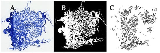 The samples were imaged using a Keyence BZ-X810 (Keyence Corporation of America, Itasca, IL, USA) fluorescent microscope using a 4X objective, and then ImageJ (Version 1.53t, NIH, Bethesda, MA, USA) was used to conduct a pore size analysis of the images obtained. The images were uploaded into ImageJ (Figure 1A), thresholded (Figure 1B), and the “Analyze Particles” function was used to obtain values for the area of each particle (pore) within the image (Figure 1C). Each area measurement was converted into diameter measurements assuming a circular pore shape. The threshold value was selected by comparing the relative pore size and size of sectioning artifacts across all samples prior to analysis and was consistently applied to each tissue section. The average pore diameters from each scaffold section were then averaged together to obtain the overall average pore diameter for each freezing temperature group.