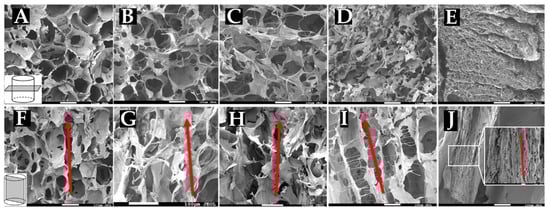 Scanning electron microscopy images of collagen sponges. Collagen sponges frozen at (A,F) −20 °C, (B,G) −40 °C, (C,H) −60 °C, (D,I) −80 °C, and (E,J) −196 °C. Cross sections of the sponges (A-E) reveal interconnected porous structure, while longitudinal cuts of the sponges (F–J) reveal longitudinal alignment of pores. Red arrows indicate direction of alignment. Scale: 100 µm.