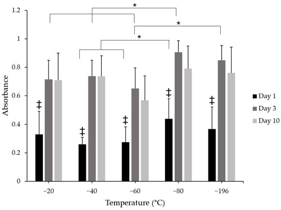 CCK8 metabolic analysis of C2C12 myoblasts cultured on collagen sponges. Absorbance values show increases in cell metabolism levels between day 1 and days 3 and 10. * indicates significance between indicated groups across treatment conditions at the same time point and ‡ indicates significance between day 1 and days 3 and 10 within the same freezing temperature as determined by one-way ANOVA with Tukey post hox analysis (p < 0.05). Error bars represent standard error of the mean.