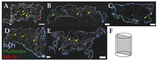 Sections were washed in 0.05% (v/v) PBS-Tween (PBST) for 20 min to remove excess OCT. Samples were blocked with 5% (w/v) bovine serum albumin (BSA) in PBST for 30 min. The primary solution consisting of antibodies targeted myosin heavy chain (MF 20-s; 1:10; Hybridoma Bank, Iowa City, IA, USA) in 1% (w/v) BSA/PBST was added to the sections and incubated at room temperature for 2 h. Sections were then washed with PBST three times for 10 min each. Secondary antibody (Alexa Fluor 594; 1:250; Invitrogen, Waltham, MA, USA) and phalloidin (1:500; Alexa Fluor 488; Invitrogen) were diluted in 1% (w/v) BSA/PBST, added to the samples, and incubated at room temperature for 1 h. Afterward, the slides were washed in PBST three times for 10 min each. A mounting medium containing DAPI (Abcam, Waltham, MA, USA) was added to the samples, and they were then sealed with coverslips. Once immunostaining was complete, the slides were imaged using the Keyence BZ-X810 fluorescent microscope.