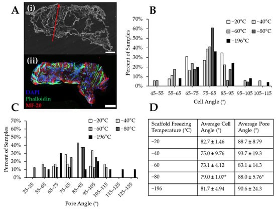 To determine the impact of pore size on myoblast alignment, pore and cell nucleus angle were measured with ImageJ. In some groups such as scaffolds frozen at −20 °C, immature myofibers were found to form through the pores in the collagen scaffolds, indicated by the presence of MF-20-positive staining (Figure 8A). The myoblast nuclei angles were measured, aggregated into 10° bins, and plotted as a histogram. Myoblast nuclei tended to align between 75–85° of each image (Figure 8B) with almost all cells aligning within 30° (i.e., 65–95°). The pore angles of each scaffold were also measured, aggregated into 10° bins, and plotted as a histogram (Figure 8C). These data indicated that most scaffolds contained pores oriented at angles between 75–105° (Figure 8C). Collagen sponges frozen at −20 °C and −80 °C produced scaffolds with the most aligned pores, while the other experimental groups had wider distributions of pores throughout the analyzed histogram bins. Myoblasts cultured on scaffolds frozen at −80 °C aligned more uniformly than other scaffold groups, as approximately 60% of cells in −80 °C scaffolds were oriented at an angle between 75–85°. However, the cells in the −80 °C scaffolds did not align in the direction of the pores, which is necessary for the regeneration of unidirectionally aligned myofibers. This is indicated by a significant difference found between the myoblast and scaffold pore angles (Figure 8D). There were no significant differences between pore and cell angle for any other freezing groups, indicating that cells in these scaffolds generally aligned in the direction of pore alignment (Figure 8D). The scaffolds frozen at −20 °C resulted in the tightest distribution of pore alignment in the longitudinal direction and also displayed the highest percentage of pore alignment being found to be 85–95°. Qualitatively, scaffolds frozen at −20 °C also had the smallest differences between the cell and pore angles.