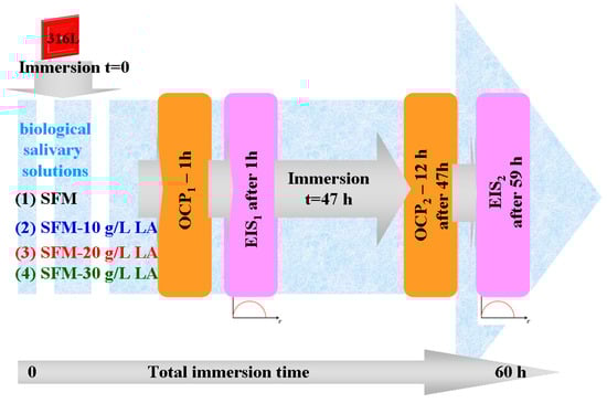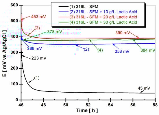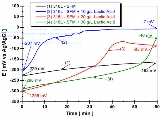 The evolution of the open circuit potential of 316L stainless steel was monitored for 12 h after 47 h from immersion in working solutions of (1) SFM; (2) SFM doped with 10 g·L−1 LA; (3) SFM doped with 20 g·L−1 LA; and (4) SFM doped with 30 g·L−1 LA.
