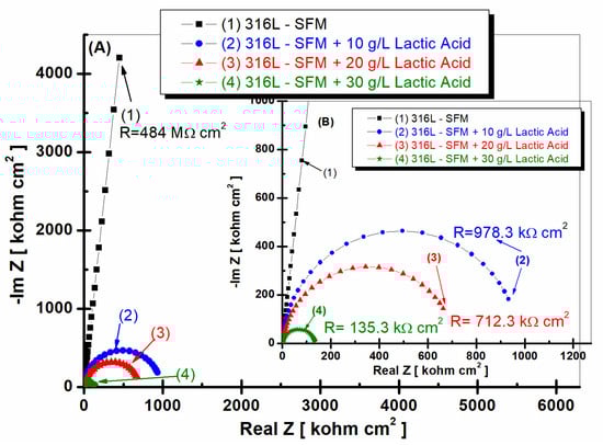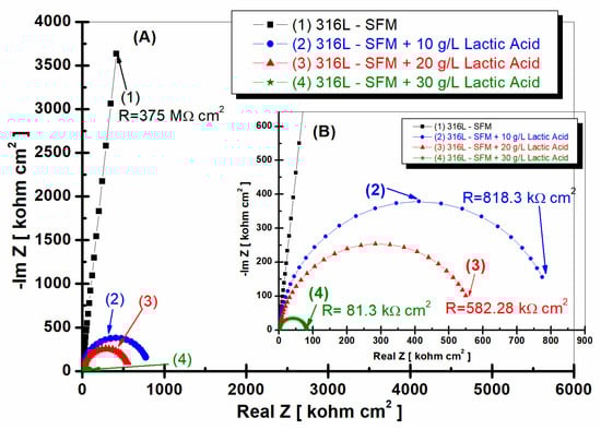 The lowest specific resistance value in our study, 135.3 kΩ·cm2, is observed when the 316L stainless steel is immersed in SFM doped with 30 g·L−1 lactic acid. This suggests a decrease in the electrochemical impedance encountered by the stainless steel in the presence of a higher LA concentration.