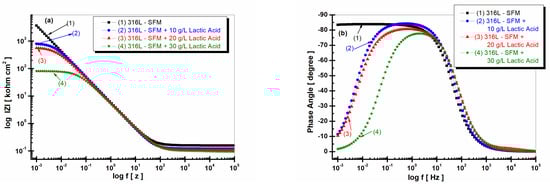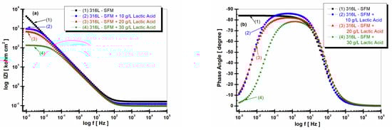 The lowest impedance modulus is revealed by 316L stainless steel immersed in Fusayama Meyer doped with 30 g·L−1 LA, as seen in Figure 8, curve (4). This behavior suggests that LA in a higher concentration affects the surface of 316L stainless steel, increasing its reactivity and susceptibility to degradation by the corrosion process.