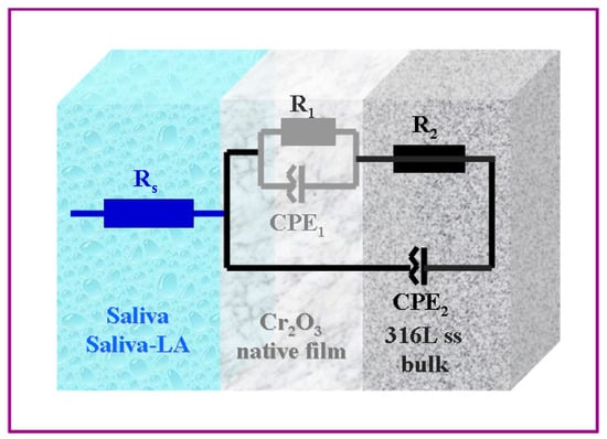 EIS, a non-destructive technique, delivers time-sensitive data not only about the inherent properties of materials but also about the progression of various processes, including corrosion degradation and other electrochemical activities. For the evaluation of the EIS results and the specific resistance or the polarization resistance, the experimental results of the EIS are fitted with an equivalent electrical circuit that best describes the interface of the 316L stainless steel through the natively formed Cr2O3 and the SFM solution. The fitting was carried out with Zview software, and the accuracy of the results was verified by the chi-square value obtained at 10−4. The electrical equivalent circuit proposed is shown in Figure 5.