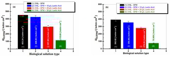The values of the 316L impedance modulus at 0.01 Hz immersed in SFM doped with different concentrations of LA are lower after one hour from immersion, as seen in Figure 9a, columns (2), (3), and (4), and decrease slowly after 59 h from immersion, as seen in Figure 9b, columns (2), (3), and (4). The lowest value is recorded at the concentration of 30 g·L−1 lactic acid in saliva, as seen in Figure 9a,b, column (4).