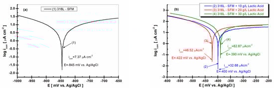 In Figure 10a,b, the corrosion current densities of 316L stainless steel are shown. As can be seen, the corrosion potential of 316L stainless steel is shifted to more positive values, shown in Figure 10b, compared with the corrosion potential of 316L immersed in SFM, which revealed a more negative value, shown in Figure 10a.