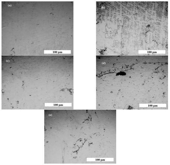Optical microscopy micrographs of 316L stainless steel: (a) before corrosion tests; (b) after immersion in SFM; (c) after immersion in SFM doped with 10 g·L−1 LA; (d) after immersion in SFM doped with 20 g·L−1 LA; and (e) after immersion in SFM doped with 30 gL−1 LA.