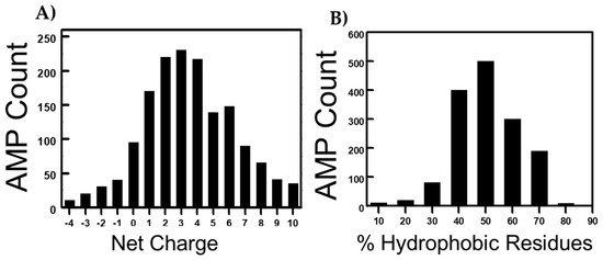 Distribution of antimicrobial peptides (AMPs) in the Antimicrobial Peptide Database concerning two critical parameters: net positive charge and percent hydrophobicity. Panel (A) provides insights into the distribution of AMPs according to their net charge, highlighting variations across different charge states. Panel (B) depicts the distribution based on the presence of hydrophobic amino acid residues within the AMPs. The Antimicrobial Peptide Database can be accessed at https://aps.unmc.edu/database (accessed on 15 June 2023) for comprehensive details.