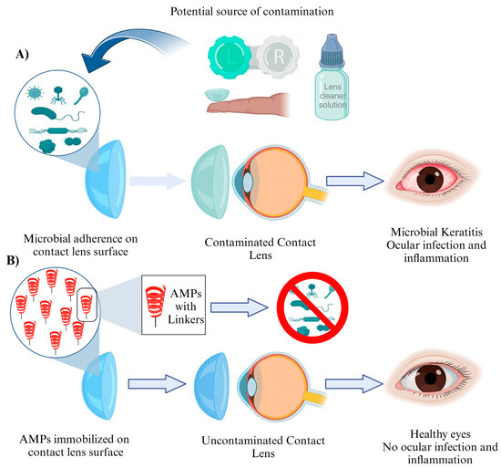 Contact lenses have revolutionized vision correction, providing a convenient and comfortable alternative to traditional eyeglasses. However, despite their numerous advantages, contact lenses pose a risk of infection due to microbial colonization on their surfaces [98]. This concern has led to significant efforts in developing novel contact lens materials with built-in antimicrobial properties. Contact lens-associated microbial keratitis (CLMK) is a serious condition that can lead to vision loss if left untreated [99]. The risk of CLMK arises from bacterial adhesion, biofilm formation, and subsequent infection on the lens surface. Traditional contact lenses, although effective in vision correction, lack inherent antimicrobial properties, making them susceptible to microbial colonization. Therefore, there is a pressing need for contact lenses that actively combat microbial growth to minimize the risk of infections. Researchers have focused on developing strategies to immobilize AMPs onto contact lens surfaces, ensuring sustained release and prolonged antimicrobial efficacy. One such approach involves the covalent attachment of AMPs to the lens material, allowing for controlled release over time. Another method utilizes hydrogels with AMPs encapsulated within, enabling a slow release of the peptide. These approaches not only provide antimicrobial properties but also maintain the biocompatibility and optical properties required for comfortable vision correction (Figure 3).