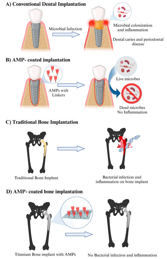 Applications of AMPs in dental care and bone graft treatment: (A) Conventional implants are unable to repel microbial infections; (B) AMP-coated implants kill bacteria promoting oral health; (C) Traditional bone implants lack inherent antibacterial properties; (D) Titanium alloy implants with AMPs inhibit bacterial growth.