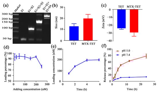 Characterization of the MTX-TET nanoparticles. (a) PAGE electrophoresis of the TET. (b) The particle sizes of the TET and MTX-TET. (c) The zeta potentials of the TET and MTX-TET. (d) The loading efficiency of the MTX in the TET. (e) The minimum loading time. (f) The release efficiency of the MTX under different pH values.