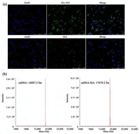 Characterization of the HA-TET/ssDNA-HA nanoparticles. (a) Representative fluorescence image of the TET uptake by the RAW264.7 cells; (scale bar: 250 μm). (b) Mass spectrometry analysis of the ssDNA and the ssDNA-HA.