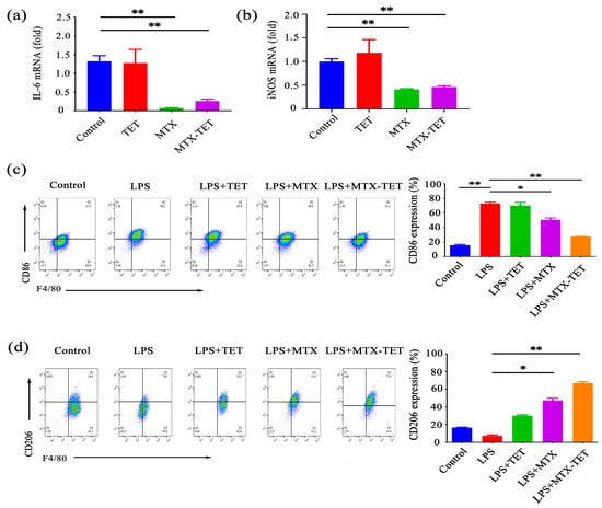 The characterization of the macrophage polarization induced by the MTX-TET. (a,b) PCR showing the expression of the pro-inflammatory genes IL-6 (a) and iNOS (b) in the RAW264.7 cells. (c,d) Flow cytometry showing the expression of the pro-inflammatory phenotype marker CD86 (c) and anti-inflammatory phenotype marker CD206 (d). (n = 5. * p < 0.05, ** p < 0.01).