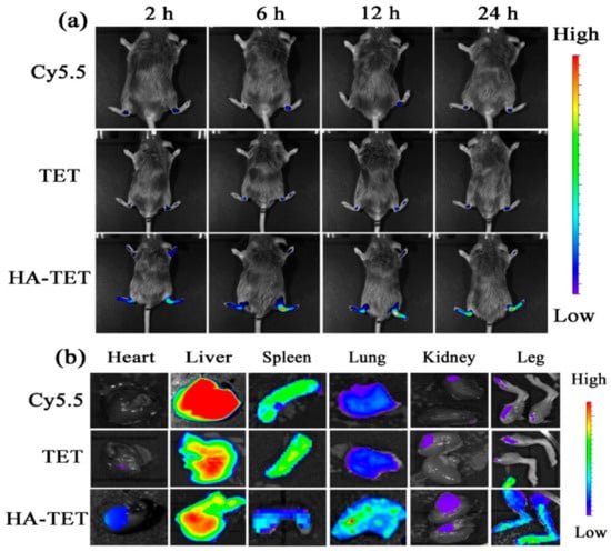 To assess the specific targeting of the HA-TET to inflamed tissues in RA, Cy5.5 solution, a TET solution, and HA-TET were injected intravenously into the CIA mice and the fluorescence signals of their hind paws were monitored using a near-infrared imaging system (NIRF). Real-time imaging showed that the fluorescence intensity reached its maximum value at 12 h, and the fluorescence intensity of the HA-TET group was much higher than the TET and Cy 5.5 groups, indicating that the HA-TET could accumulate in the inflamed joint (Figure 4a). Further analysis of the biodistribution of the TET and HA-TET in major organs and inflamed paws 24 h after injection revealed that the TET and HA-TET were predominantly distributed in the inflamed paws, and the fluorescent signals in the HA-TET group were much stronger than that of the TET group (Figure 4b). These results suggested that the targeting efficiency of the HA-TET was significantly improved compared to that of the TET alone.