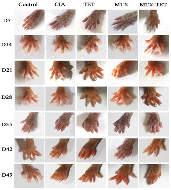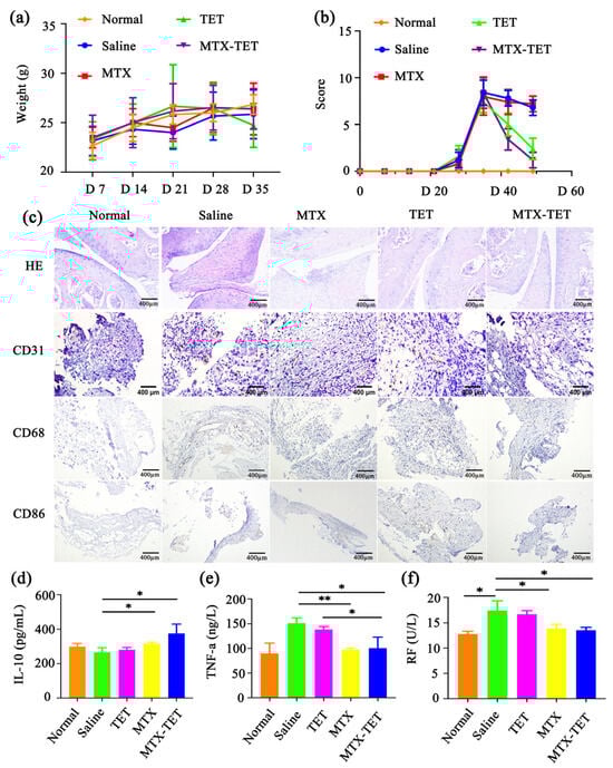 The CIA model mice were randomly divided into normal, saline, TET, MTX, and MTX-TET groups. All groups except the normal group were modeled and immunized twice on day zero and day seven, respectively. Weekly observations, weighings, and evaluations of the CIA modeling scores were conducted. The results showed that the MTX-TET could significantly reduce the degree of joint swelling, with a negligible weight change (Figure 5a). Additionally, the CIA modeling scores for the MTX and MTX-TET groups were obviously decreased, with the alteration being higher in the MTX-TET group (Figure 5b). Compared to normal mice, the CIA mice treated with the MTX-TET showed relief of disease symptoms, including reduced paw redness and swelling (Figure 6). After three weeks of treatment, the mice were sacrificed, and their joint synovium samples were collected for examination. The synovium samples were embedded in paraffin sections for HE-staining and immunohistochemical (IHC) staining using CD31, CD68, and CD86 antibodies. The HE-staining results revealed an even distribution and regular arrangement of the synovial cells in the normal group. On the other hand, the cells in the saline and TET groups exhibited abnormal proliferation and a substantial number of infiltrated inflammatory cells. The MTX-TET group showed improvements in synovial hyperplasia, with less infiltration of inflammatory cells (Figure 5c). CD31 is commonly used to demonstrate the presence of endothelial cells in tissues and to assess vascular density in tissues []. The IHC results showed that the expression of CD31 in the synovial membranes of the saline group was significantly higher compared to that of the normal group, while it was reduced in the MTX group and not present in the MTX-TET group (Figure 5c). The expression of CD68, a 110 kD glycoprotein expressed by macrophages and associated with lysosomes [], was higher in the saline group than it was in the normal group, but after the MTX-TET treatment, the inflammation was dramatically reduced (Figure 5c). Meanwhile, CD86 is considered a reliable biomarker for disease severity and response to therapy []. The expression of CD86, a typical marker of macrophage M1, was decreased in the MTX-TET group (Figure 5c). Therefore, the MTX-TET treatment reduced the inflammation and prevented damage to the bones and cartilage tissues in the ankle joints of the CIA mice.
