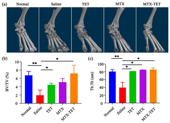 Finally, we retained the distal tibia of the right hind limbs, ankle joints, and paws of the mice, and we performed a micro-CT scan and 3D reconstruction after removing the excess soft tissues (Figure 7a). The results indicated that the CIA group had obvious bone damage in the ankle and toe joints. The TET did not show a significant therapeutic effect. The free MTX showed good results in treating the CIA mice, but slight bone destruction was still present. In contrast, the MTX-TET group showed the significant alleviation of bone destruction. The data analysis revealed that the MTX-TET could significantly improve the ratios of the bone volume fractions (BV/TV) and the trabecular thickness of bone (Tb. Th) (Figure 7b,c).