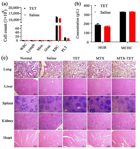 To evaluate the safety of the MTX-TET, a thorough examination of the mice’s blood samples was conducted. The results, depicted in Figure 8a, demonstrated that there were no differences in the proportions of white blood cells (WBC), including lymphocytes (Lymph), monocytes (Mon), and granulocytes (Gran), as well as the red blood cells (RBC), and platelets (PLT), between the MTX-TET and control groups. Moreover, the function of the red blood cells was evaluated through the indices of hemoglobin (HGB) and mean corpuscular hemoglobin concentration (MCHC). The results, shown in Figure 8b, indicated that the levels in the TET-treated group were comparable to those in the saline-treated group. The results of the HE-staining for the major organs such as the lungs, livers, spleens, kidneys, and hearts showed that there were no obvious lesions in any of the organs of the MTX-TET groups (Figure 8c). These results showed the good biocompatibility of the TET.