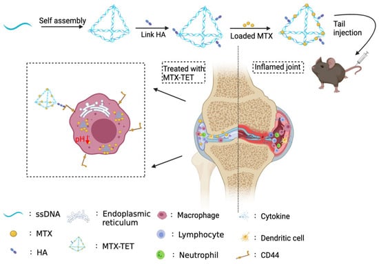 In this study, we aimed to construct a methotrexate-loaded DNA tetrahedron (MTX-TET) to treat RA (Scheme 1). Hyaluronic acid (HA) possesses a special CD44 receptor binding ability, which can specifically target macrophages that have been conjugated to TET according to the NHS-EDC reaction []. HA-TET can target activated macrophages at the site of inflammation. We prepared an MTX-TET treatment and examined its properties, its effect on macrophage viability and polarization, and its therapeutic effect on CIA model mice. Our findings offer a new approach for the clinical treatment of RA.