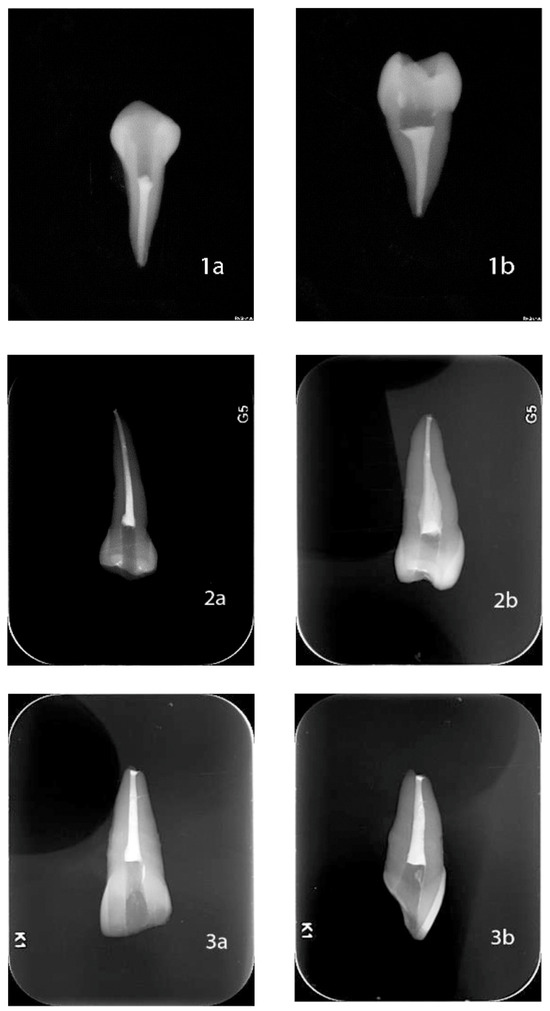 In all the filled root canals, vestibule-lingual and mesiodistal radiographs were taken of each root to verify its correct condensation. Facial and proximal views of digital radiographs of all teeth roots were taken to verify the canal obturations. Figure 1 illustrates radiographic images depicting root canals filled using the three techniques examined in the current study.