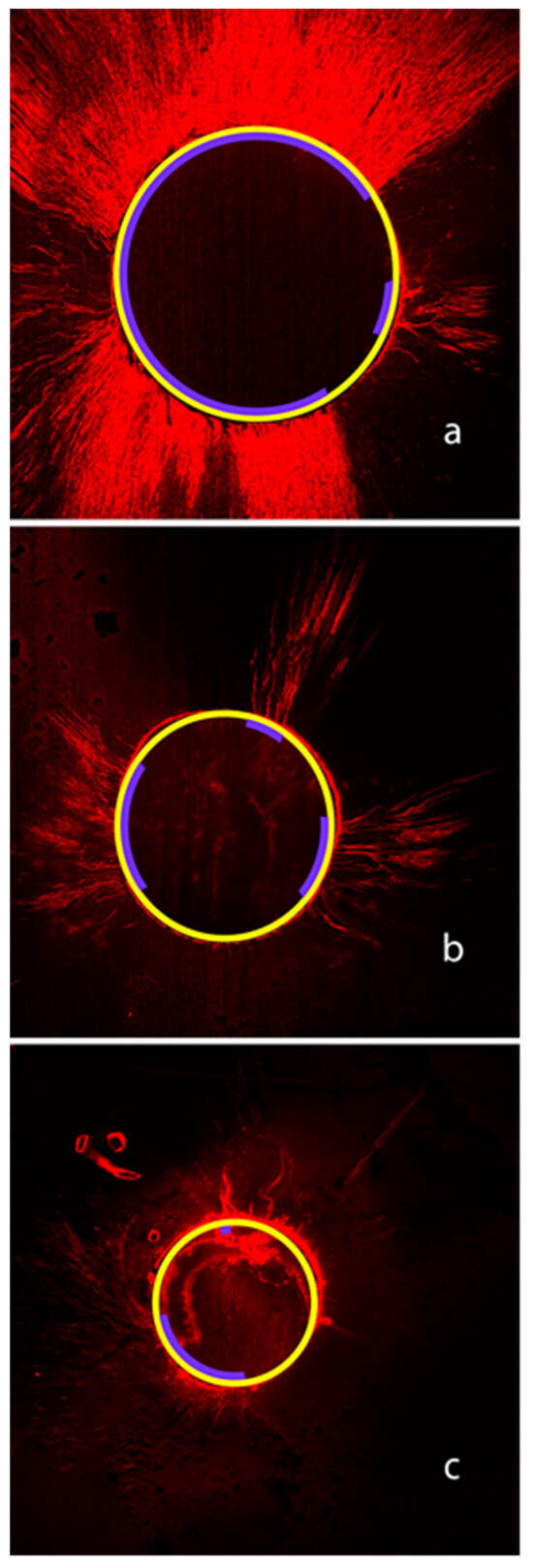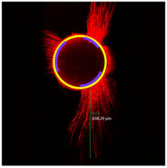 The images were evaluated according to the method used by Gharib et al. [27] for measuring the depth of penetration; each image was imported into the Leica Confocal Software Version 2.1E and, using the distance tool software, the point of deepest penetration was measured from the canal wall to the area of maximum sealer penetration (Figure 2). Each image was imported into the Image J software (Rasband WS, ImageJ, 1.54; US National Institute of Health, Bethesda, MD, USA) to calculate the percentage of sealer penetration, and the root canal’s circumference wall was measured. Next, the areas along the canal walls in which the sealer penetrated dentinal tubules (sealer tags) were outlined and measured using the same method. The percentage of the canal walls where the sealer had penetrated was calculated by dividing the canal circumference’s outline by the entire circumference (Figure 2).